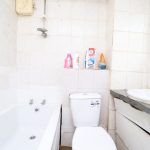 Three piece bathroom suite. Fully tiled, bath with a shower head attachment and separate taps, low level flush WC and washbasin with a mixer tap.