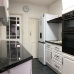 Tiled flooring, range of eye-level and base units, laminate wood work surface, stainless steel sink with mixer taps, integrated oven, electric hob with extractor fan, part tiled walls, space fridge freezer, various power points, double-glazed windows.