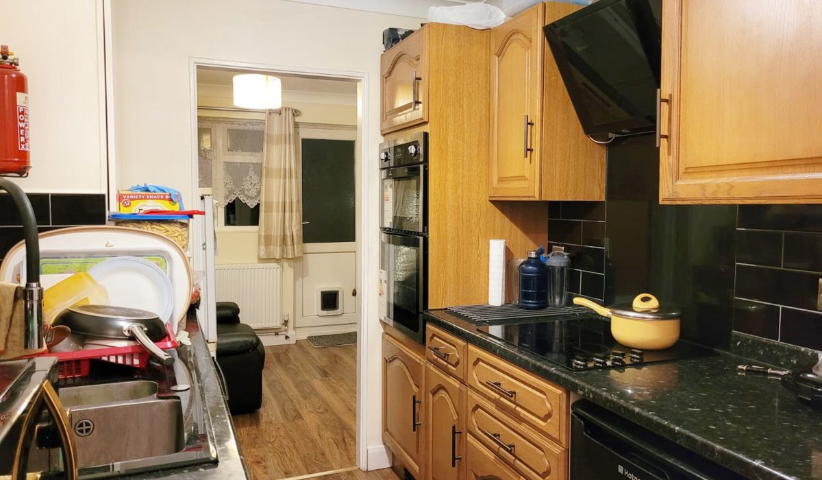 Laminate flooring, range of eye and base level units, electric cooker with an extractor fan, fridge freezer, washing machine, integrated microwave, stainless steel sink with mixer taps, and double glazed windows.