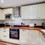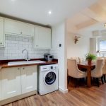 Range of eye level wall and base units, wood flooring, fully tiled walls, built-in electric hob and oven plus extractor fan, composite sink with drainer and mixer tap, space for washing machine, built-in fridge freezer and various power points.