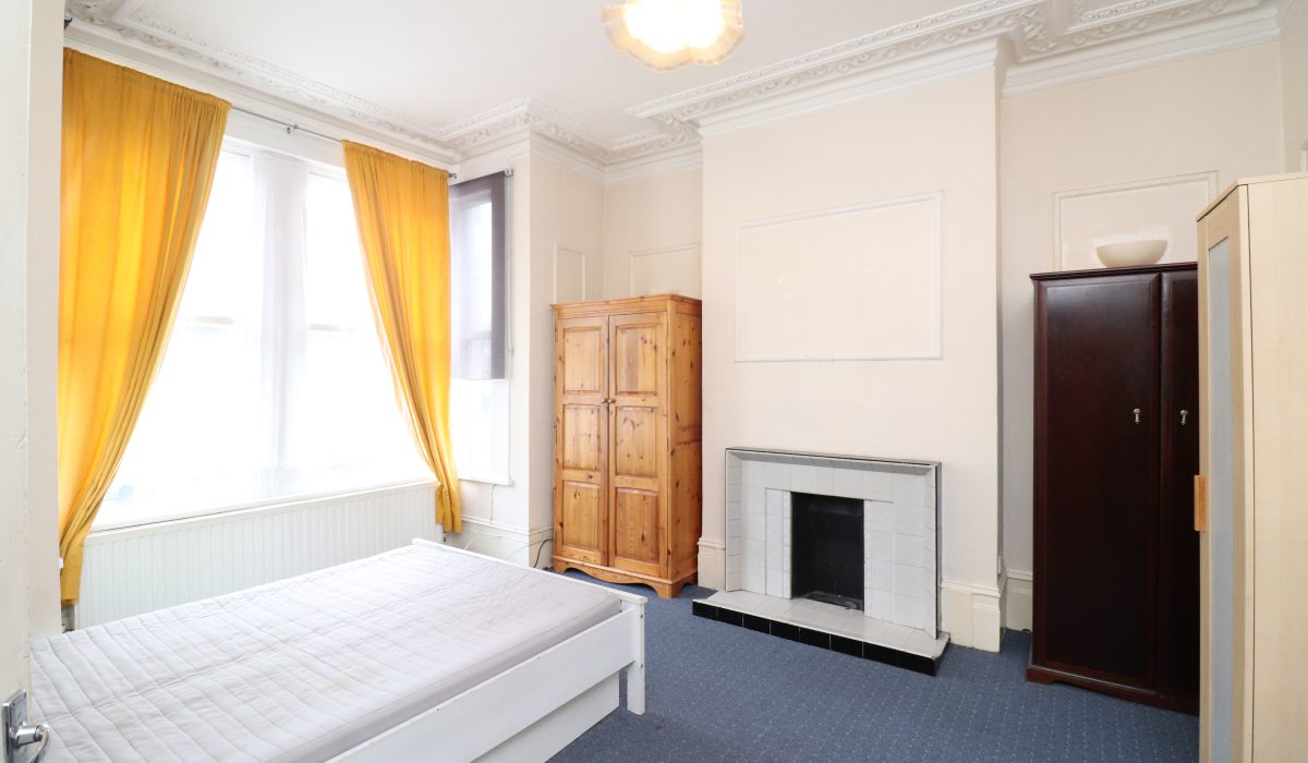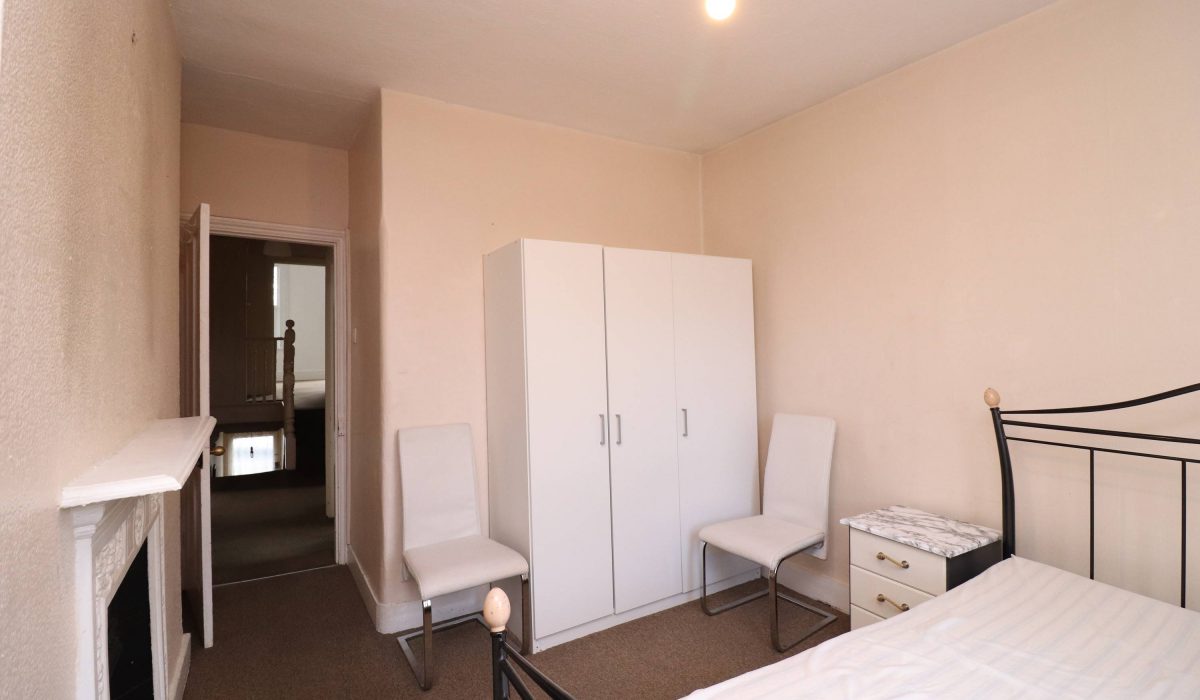 Carpeted flooring, double bed, three wardrobes, bedside table, fireplace, double glazed windows, single radiator and various power points.