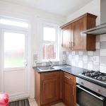 Tiled flooring and part tiled walls, range of eye level and base level units, integrated gas hob and oven with extractor fan, stainless steel sink with mixer tap, laminate worktop and access to rear garden.