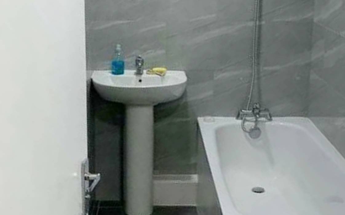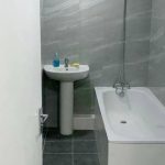 Tiled flooring throughout, low-level flush WC, wash hand basin with mixer tap and bath unit with shower attachment.