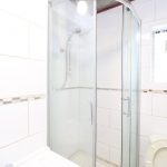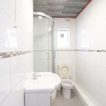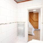 Fully tiled, low-level flush toilet, standing shower, washbasin, chrome radiator