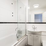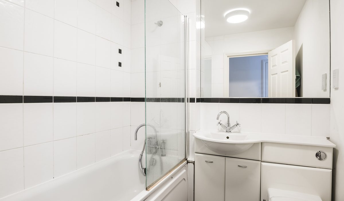 Low level flush toilet, sink with separate hot and cold mixer tap (chrome finish). Bath with shower head, integrated under-sink storage, fully tiled floor, partially tiled walls to bath and sink area, shaver socket and single radiator.