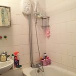 Single mixer tap sink with integrated mirror effect storage at eye level. Bath with shower head and mixer tap, fully tiled walls, vinyl flooring,