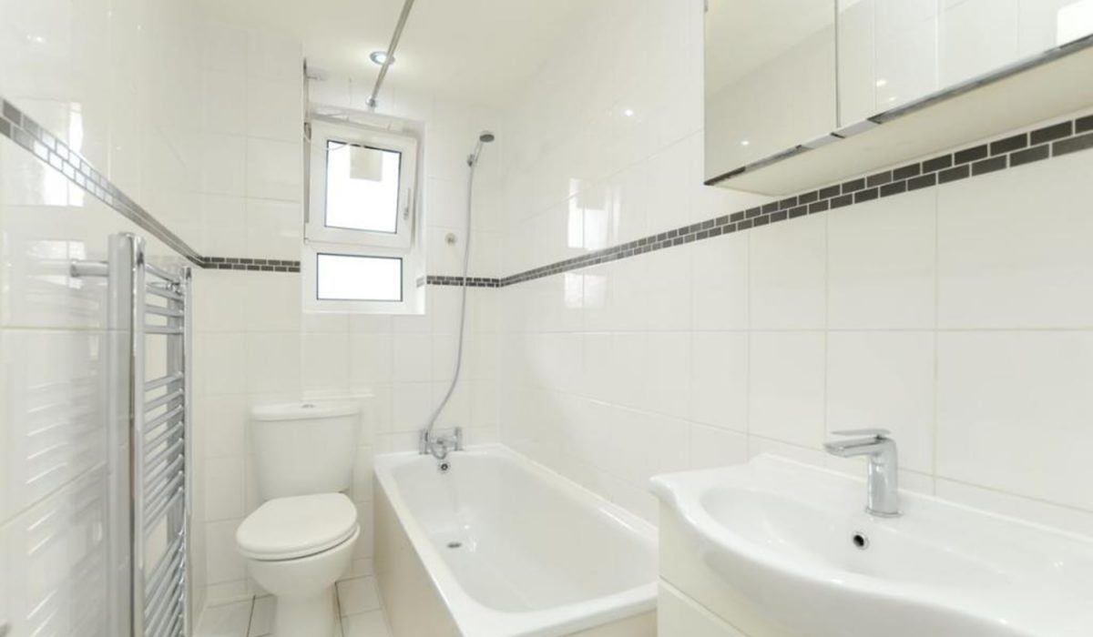 3 Piece bathroom, wash basin with mixer taps and bathtub with shower attachments, chrome radiator, toilet with a low-level flush and tiled walls and flooring throughout.