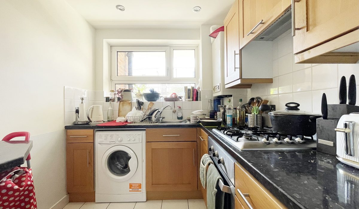 Tiled flooring throughout, part tiled walls, front aspect double glazed windows, eye and base level units, stainless steel sink, washing machine, fridge freezer, integrated gas hob and oven
