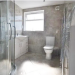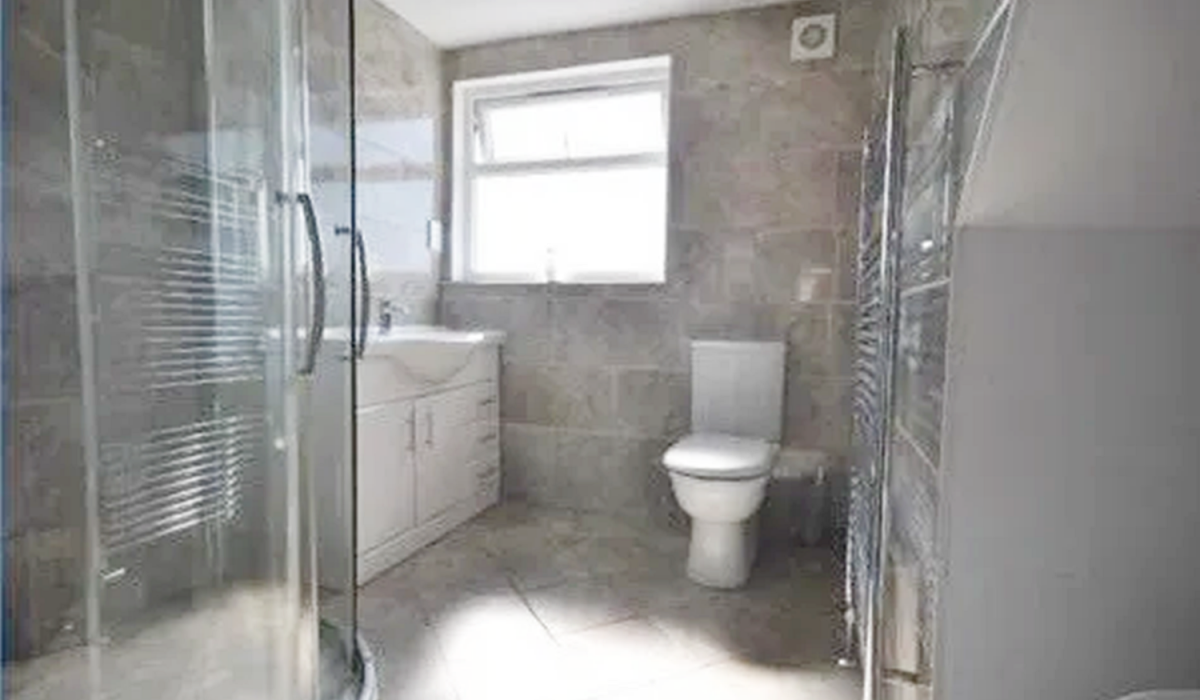 Tiled flooring and walls, low level flush toilet wash basin with mixer tap and storage compartment, walk in shower, chrome towel radiator, double glazed windows.