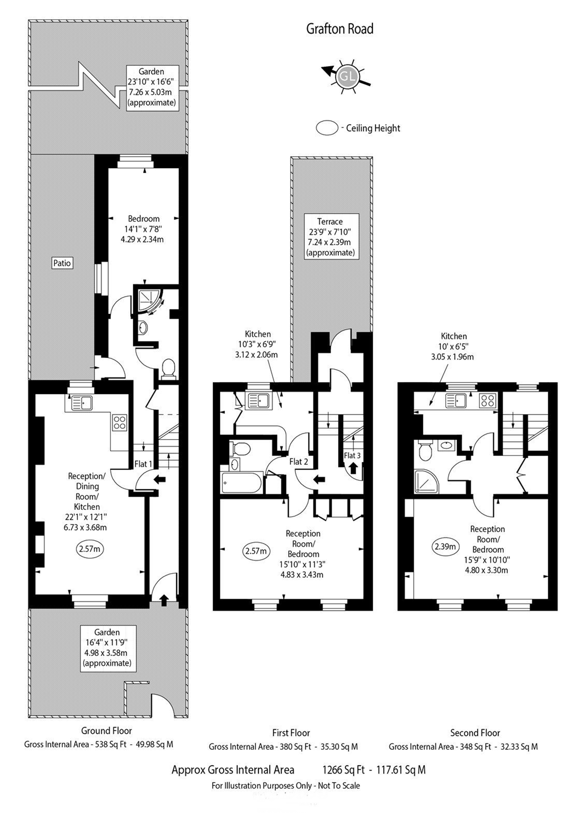 An 113.5 square metre (1222 square feet) freehold terraced property with three levels that is now divided into three units. This property consists of an entryway, reception room, and an open plan kitchen on the ground floor with a separate double bedroom garden flat which comes with a 3 piece tiled bathroom suite. Going up into the house there is a carpeted studio with a roof terrace on the first floor that needs some work and a top floor studio that has been newly refurbished to a good standard in our opinion.